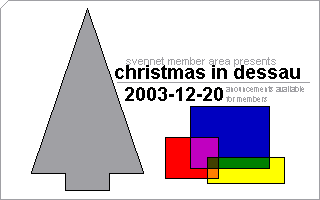 what is meant by x-mas in dessau or baunachten, as i like to call it? well, there will be an all special private christmas party at the headquarter of sven and phoenix where there will be stylish foods and drinks and they will be all in a very pure way in exact one month from this time. like the fantastic design of ikea, which is bauhaus for students and everyone else, by the way! while we are now akads there is more than one good reason to keep the flag high! maybe you are one of the chosen persons who will have an invitation in their post office in a short while! maybe? and no, in spite of our affection for interactive download things, you can not just download an invitation! sorry! but donīt be sad if your not invited. all fans of our website are in our hearts at the time of happiness and cake-overload! happy x-mas time to all of you!! questions? complaints? |