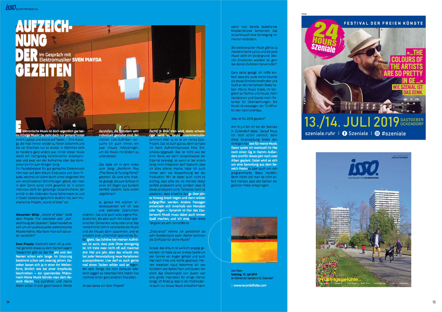electronica festival in 2018. the official announcement lists the artists as following: electronica kulturnacht miss j-by (dj set + visuals) record of tides (av live set, recordoftides.com) lemon & pilgrim (live set, lemonandpilgrim.com) facebook event the event is supposed to take place at kreativemitte, galerie der disziplinen heinrich-heinköster-straße 6 59065 hamm kreativemitte.de ![]() once agin we can expect a unique audiovisual live performance in sound and vision. you are welcome to join for free (nothing differing announced) and record in sound and vision. ![]() update 2019-04-24: there are some news on record of tides to perform at szeniale festival in gelsenkirchen on july 13. fashion designer katerina amprazi announced do a fashion show at the same venue with record of tides. amprazi talked about the collaboration in the april issue of isso magazine but has already withdrawn from the szeniale festival. also, the interview with her is no longer to find in the online version of the issue, only the captured snippet above remains. in the journal post 2019-03-30 proud guest of ‘theQ::’ by proust, curated by massard | entry by sven sven announced to be 'happy to read about our collaboration in the april issue of isso magazine, actually we did it talk about possibilities weeks ago but did not fix anything yet. even if her announcement sounds like a masterplan, we do not have much recently. anyway, I am delighted to support her show with my sound before turning to my av live set. I hope we can find a collaboration that we both are happy with, cross your fingers…' find out about katerina amprazi´s work over at katerinaamprazi.de. ![]() update 2019-04-24: the szeniale festival has already announced time, venue and supporting acts for the upcoming av live set. record of tides is supposed to play at exodus around 10pm and will be supported by wesenberg (third places) and partykumpel. get all info over at the live section. ![]() the kurzstummfilmfestival taking place at zeche carl in essen will screen 'granada interface (the lost tapes)' on may 17. the festival dealing with this year´s topic 'yellow' will expand from may 17 to 18 and also features the video piece 'beyond' to be seen in the foyer. more info soon! all info over at kurz-stumm-filmfestival.de ![]() in november 2018 the galerie treppenhaus in erlangen opened ‘hochhaus - hütte – hinterhof, der reiz des ungeliebten‘ by thomas r. hoeß, gabriella héjja and karla köhler. the exhibition also featured collaborative works by karla köhler and sven piayda like the ‘granada interface’ music video for record of tides, the ‘from new york to los angeles’ series and the ‘k-city’ series. the exhibition ended in february 2019 but returns now as permanent exhibition in the first floor of galerie treppenhaus. this permanent version of the show only features köhler´s and piayda´s ‘k-city’ series. the exhibition is supposed to be on display until the end of the year. the ludwiggalerie schloss oberhausen has opened OB-ART 2019. the show features works by local artists from oberhausen and surrounded cities. sven piayda´s cgi-photograph ‘swan cake’ (2017) is featured in the show, it will be set in the panorama gallery and will be on until june 2. piayda did not show up at any of the exhibitions but is recently working on different issues and will hopefully return with record of tides for two audiovisual live sets. ![]() the studio is recently busy with producing and rendering more complex video works, we hope to put it out one day. ‘heliodorus’ appears to be a large piece concerning data. more soon, hopefully. studio.svenpiayda.com ![]() the march issue of the isso magazine is featuring a new interview with sven piayda on record of tides. in conversation with alexander welp piayda talks about the production process, visuals, achetypes, new releases and the upcoming shows. the interview can be found in the print version as well as in the pdf version which you can download and/or open over here. the interview was given in advance of the upcoming audiovisual live show at szeniale and will also be available as text version on the resources section. a big thank you to alexander welp for this great interview. the isso magazine is a contemporary city magazine which can be found at cultural places for free. isso-online.de isso magazine march 2019 issue recordoftides.com ![]() ![]() ![]() record of tides aka sven piayda performed a secret audio only live set at electric café oberhausen at october 6. the record of tides set was only about 24 minutes long featuring tracks like ‘the saints’, ‘care’ and ‘harvest’ from the current album ‘endurance’. next to the known tracks the middle of the set was dominated by two or three quite abstract and new tracks. fortunately the performance was recorded and is available for free as digital bootleg. it is published via archive.org and can be downloaded from here. ![]() ![]() ![]() 'endurance', the fourth full length album by record of tides is released once again by the hamburg based netlabel kreislauf.org and and is distributed by achive.org and sonicsquirrel.net. ‘endurance’ has been programmed, recorded and produced in summer 2017 when piayda returned home from hospital after having a surgery to fix a pilon fracture (check the journal: 2017-10-03 the man who fell to earth (and broke a leg) | entry by sven) and using the time for a new album. the album features 20 tracks and is mostly inspired by aphex twin, boards of canada (in the pre-warp era) and guitar work by queen and seefeel. it is supposed to be the best work of record of tides so far, accorting to kreislauf.org label boss andreas buttweiler. as ‘endurance’ features about 108 minutes of music it is difficult to put it on a physical release. zany music is recently working on a cd version reducing the tracklist while adding an exclusive track to it. we will announce when the physical release