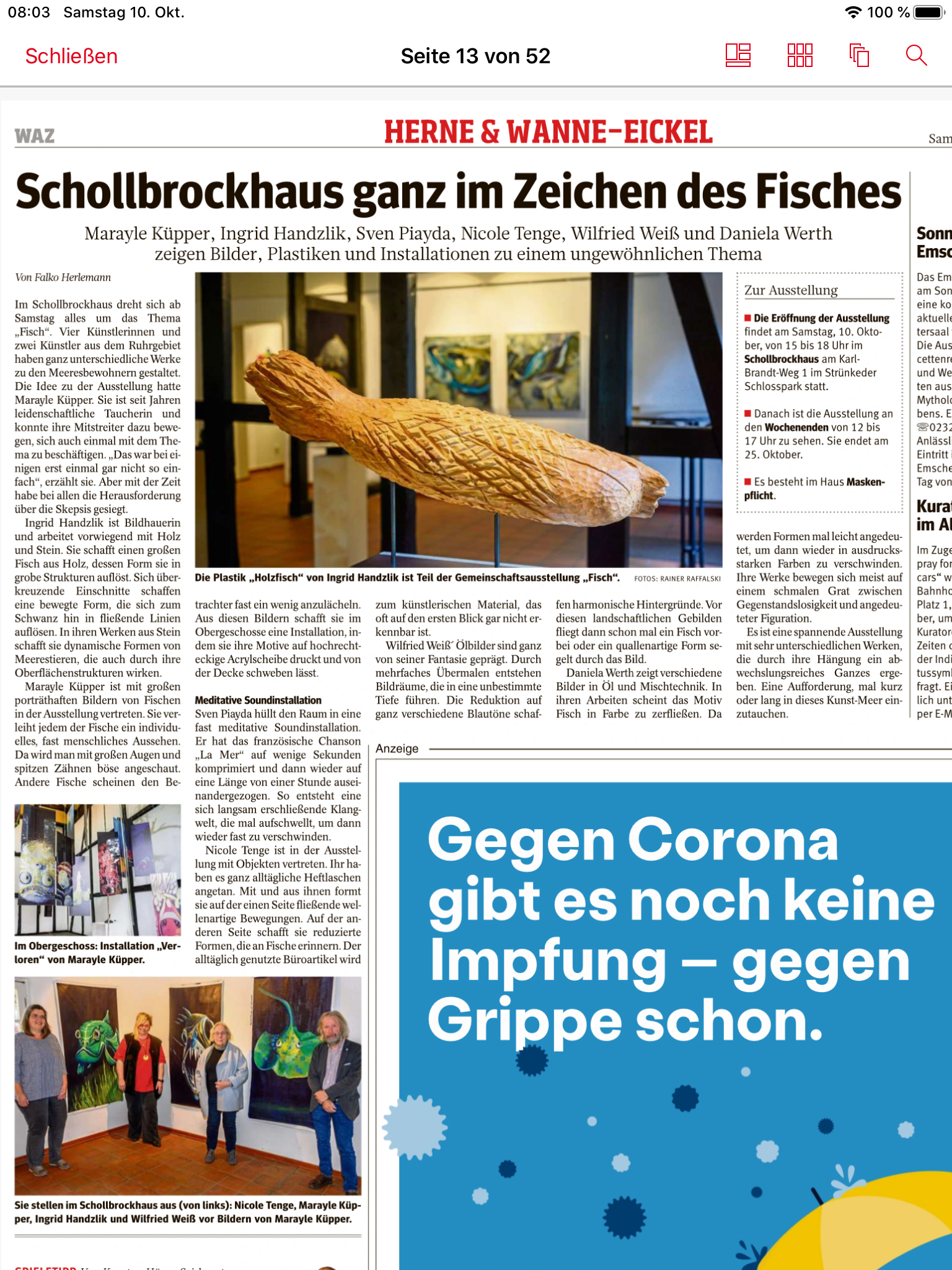 at SG1 duisburg back in 2019. participating artists are expected to be present. ’happy prince’ shows the red car body of a 1989 ford probe hovering in dutch woods in autumn. art historian linda schröer states: the photograph ‘happy prince’ shows a car body floating in the middle of the forest. the title refers to the short story of the same name by oscar wilde. there, a richly gem- and gold-studded prince monument cannot bear the misery of his city any longer, allows itself to be ‘cannibalized’ down to the last treasure and thus sacrifices itself. at the same time, however, the title also alludes to the artist richard prince, who is known above all for his astronomical prizes. in the mid-2000s, prince had stripped muscle cars down or pasted them with images of women and staged the car as a symbol of freedom, self-determination and independence. ‘the press text for we don't pray for love - we just pray for cars‘ explains: more than 2,200 kilometres of motorway run through the state of north rhine-westphalia, with a total road length of almost 30,000 kilometres, making up about 13% of the total german road length. the average daily traffic in nrw is significantly higher than the national average. in short: the ruhr area as a conurbation is more mobile than ever. especially in times of climate change, however, individual transport should be critically examined, and its advantages and disadvantages weighed against each other. the role of the car as a status symbol should be questioned with a view to the future of all of us. faster, bigger, better - how heavy can and may such attributes weigh today? an exhibition of contemporary art from the ruhr, münsterland and rhineland on the subject of mobility and the car as a status symbol. ![]() you might like to have a look at the poster and invitation card for information on participating artists and opening hours. caused by the covid-19 situation there will be time slots to enter and stay in the exhibition, please apologise. the opening is scheduled for september 18, sven piayda is expected to be present. more info at the bottom of this post. ![]() you might remember roger rohrbach´s name from the catalogue escorting last year´s annual show of gelenkirchen based artists. here he wrote a pretty complex text on the exhibited video piece 'heliodorus'. ![]() the kunstverein schollbrockhaus in herne will open a group show entitled ‘fisch!’ on saturday, october 10, at 3 to 6pm. next to paintings by marayle küpper and daniela werth the exhibition will feature the ‘la mer’ sound piece by sven piayda. the 2013 work will sound through the exhibition running until october 25. above you see the installation view at lutherturm in cologne for LTK4. more info soon. ![]() it is our massive pleasure to announce an upcoming record of tides live performance. the ‘feuer and flamme’ festival will place art and music in a dedicated church for four days. it was originally planned to take place during the pentecost season but had to be delayed due the covid-19 pandemic. within this festival record of tides will perform a compact live set on tuesday, november 3, 7pm. up to current information the set is expected to be audio only, changes and updates will be communicated here. this will definitely the last performance for 2020, based upon the developing of the covid-19 community spreading the festival might modify of cancel schedules. live section recordoftides.com ![]() the well appreciated ‘ansehBar’ art show in public space has taken sven piayda´s ‘lifeguard’ off display now. as the show starts into its second month, further artists will take over and the current works vanish. ‘lifeguard’ is demounted and replaced by a work by one of the artists of the second run. still we do not know who will get this prominent place. sven piayda´s contribution ‘lifeguard’ was placed at a prominent position. the billboard could be found at augustastraße/weberstaße in downtown gelsenkirchen. the piece incidentally interacted and mirrored its surrounding: the trees in the picture seemed grow into the trees on the street, the ‘lifeguard’ surrogate had the same colour as the nearby trash bin and the pillars of the lifeguard´s housing corresponded with the billboard´s pillars. the places had been chosen incidentally but sven piayda and everyone at the studio were very happy with this place. find all collected pictures of the work and the press conference over at the exhibitions section. above you see a snapshot taken during the art walk with gelsenkirchen major candidate karin welge (spd) with piayda on the left talking about the piece. based upon the problematic issue of impossible big openings and the loss of opportunity for artists to show and sell work the gelsenkirchen based szeniale organisation developed 'ansehBar' as answer to the covid-19 crisis, a billboard based outside exhibition project curated by nancy e. watt and christoph lammert. with this action we don't just want to bring beautiful colourful pictures into the city. it is above all about strengthening and sharpening the perception. if art and culture cannot be present in public space to the usual extent, or if no (regular) form of organizing presentation is possible, it is necessary to fill and enliven this space in a different way. art and culture are vital, they are building blocks of a successful society, signs of democratic coexistence and - under all circumstances - to make them visible in public space, the curators state. 'ansehBar' wants to make art in times of distance rules experienceable in an unusual way: wherever else advertising can be seen, artistic works will be shown from july to september 2020. in cooperation with the department of culture of the city of gelsenkirchen, the förderverein szeniale invites up to 30 artists from the gelsenkirchen independent scene to present themselves publicly and strikingly in the urban space. for this purpose, the me
